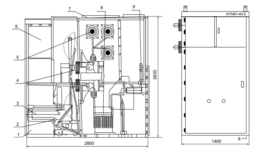 1、殼體、 2、活門支架、 3、斷路器手車、 4、觸頭盒、 5、母線套管 6、儀表室、 7、泄壓裝置 、8、電流互感器、 9、接地開關(guān)